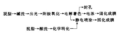 其中實例1表示建筑鋁型材表面處理目前有四種工藝過程,可以得到三種表面膜即陽極氧化膜、陽極氧化復合膜以及靜電噴涂層。實例2是通用工程的鋁合金陽極氧化工藝,視產(chǎn)品要求可以分別采用草酸、硫酸或硬質(zhì)陽極氧化(硬質(zhì)氧化一般不封孔)。裝飾用鋁合金部件陽極氧化之前,一般要進行表面機械修整、化學拋光或電化學拋光,以提高表面均勻性與光亮度.此外鋁合金的化學轉(zhuǎn)化涂層(如鉻化).在汽車或飛機的某些部件上,作為最終表面處理措施一直還在使用。不過化學轉(zhuǎn)化處理大量用于噴涂之前制備中間過渡層,以改進涂層的附著力,提高涂層的耐蝕性.降低涂層下絲狀腐蝕的危險。在一些特殊場合,如要求表面導電、表面金屬質(zhì)感時,電鍍或化學鍍也不失為一個好方法。鋁合金部件表面搪瓷琺瑯化也有應用.提高了鋁表面外觀裝飾效果,改進了耐蝕與耐候性能。