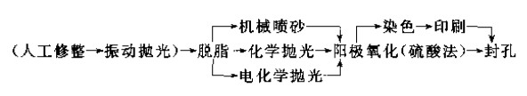鋁合金表面處理技術(shù)有:表面機械預處理(機械拋光或掃紋等)、化學預處理或化學處理(化學轉(zhuǎn)化或化學鍍等)、電化學處理(陽極氧化或電鍍等)、物理處理(噴涂、搪瓷琺瑯化及其他物理表面改性技術(shù))等。在實際工程中不可能采用單一方法,而總是一個系統(tǒng)工程.包括一系列串聯(lián)的工藝過程。以下舉三個不同產(chǎn)品的實例,說明其不同的工藝路線和步驟。