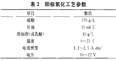 (4)陽極氧化工藝參數鋁合金陽極氧化工藝參數如表2所示。