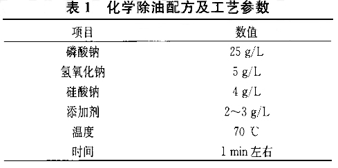 (2}堿洗(脫脂)脫脂是陽極氧化預處理中非常重要的一步,脫脂做得不徹底會影響鍍層與基體金屬的結合力或使氧化膜層發花。本工作采用的化學除油配方及工藝參數如表1所示。
