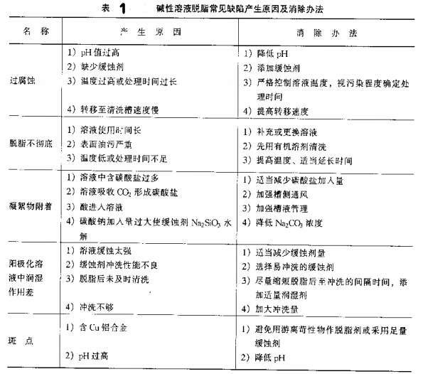(3)堿性溶液脫脂堿性溶液脫脂是表面預(yù)處理中最主要的脫脂方法之一。堿性脫脂溶液的配方相當(dāng)多。目前,一般采用磷酸鈉、氫氧化鈉和硅m鈉的傳統(tǒng)工藝,磷酸鈉、硅酸鈉在溶液中,除了起緩蝕、潤濕作用外,還可因水解生成游離堿而控制氫氧化鈉含量的變化,使榕液保持穩(wěn)定。溶液加熱和攪拌均有助于獲得最好的脫脂效果。溫度對(duì)堿性溶液脫脂影響極為顯著,在49℃以上每升高11℃,效率可提高100%。用純凈的壓縮空氣攪拌可使溶液的濃度、溫度趨于均勻,增加溶液與制品表面的摩擦,同時(shí)也有利于采用較低濃度的溶液。堿性溶液脫脂常見缺陷產(chǎn)生的原因及消除的辦法見表1