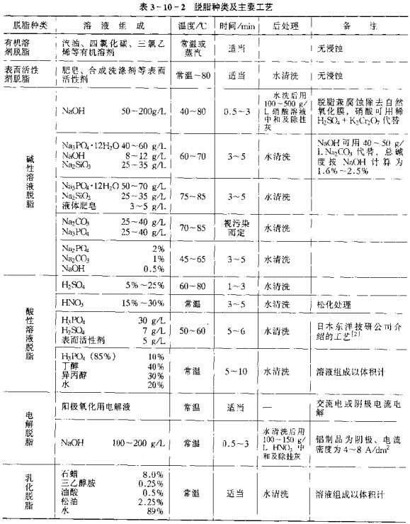 鋁制品脫脂除上述五種方法外,還有乳化脫脂,它所用溶液為互不溶解的水與有機(jī)溶劑組成的兩相或多相溶液,并添加有降低表面張力及對(duì)各相均有親合力的去污劑。鋁制品的幾種脫脂方法及主要工藝列十表2。在這些方法中,以堿性溶液,特別是熱氫氧化鈉溶液的脫脂最為有效,也是最經(jīng)濟(jì)和最安全的。