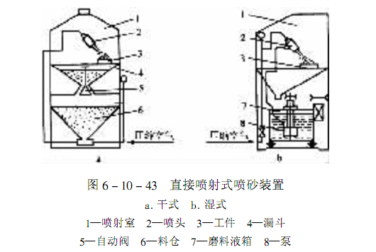 圖6一10一44為直接噴射式噴砂裝置,工件3安放在噴射加工室1內,壓縮空氣帶著壓力料倉6中的磨粒經噴頭2斜射到工件上。濺落下來的磨粒由漏斗4收集并經自動閥5流回壓力料倉,繼續循環使用。圖6一l0一431,為濕式噴砂裝置。