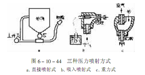 噴射加工方式有三種,如圖6-10一44所示。圖中的干式噴砂,粉塵較大,污染嚴重。因此,普遍采用的是濕式噴砂。