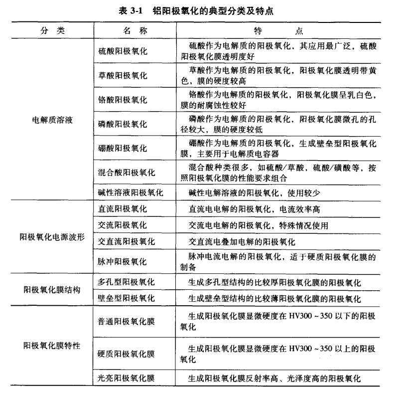 對于鋁及其合金而言,是一種“萬能”的提高防護性和裝飾性,甚至功能性的有效方法。鋁的陽極氧化處理工藝可以從多種角度加以分類,比如按照電解質溶液、陽極氧化電源波形、陽極氧化膜結構、陽極氧化膜的特性等加以分類,如表3-1所示是陽極氧化的各種分類方法和主要特點。