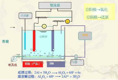 電流通過時,陰極上,析出氫氣;陽極上,析出的氧(包括分子氧、原子氧和離子氧),通常在反應中以O2表示。作為陽極的鋁被其上析出的氧所氧化,形成無水的陽極氧化鋁膜。