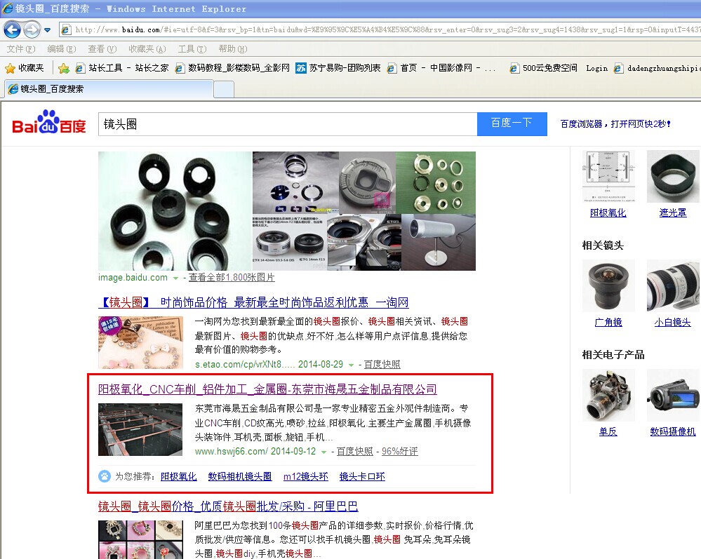 前期我們通過“鏡頭圈”一詞,提升了網站百度權重,通過近一年時間,我們在搜索“鏡頭圈”你一定會發現,我們排名很靠前,(導讀:利用“鏡頭圈”群推廣增加百度的排名 http://www.whsygw.com/Article/liyongjintouquan_1.html)“鏡頭圈帶來的客戶幾乎都是大公司廠家,但是要獲得更多精準客戶,后期我們要換下“鏡頭圈”改為“金屬圈”那樣在五金加工行業用的更廣泛,希望有加工“金屬圈”的客戶能第一時間能找到我們。