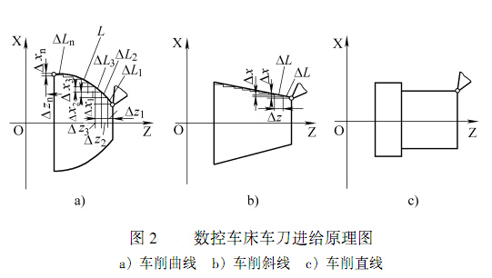 在圖2a的曲線車削加工中,可以把曲線L細(xì)分為△L1、△L2......△Ln。等線段。車刀在Z坐標(biāo)和x坐標(biāo)方向上單位時問內(nèi)的位移量為△z1、△X1),即可合成線段△L1。由于△Ln的斜率在不斷變化,進(jìn)給分量△xn/△zn也會隨之變化,車床數(shù)控系統(tǒng)不斷發(fā)出連續(xù)指令,使車刀在X,Z兩坐標(biāo)方向的△x與△z的比值也變化,從而使車刀作連續(xù)位移,完成曲線車削加工。