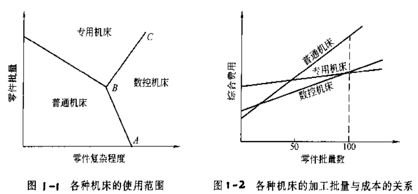 由此可見,數控機床和普通機床都有各自的應用范圍,如圖1-1所示.圖中橫軸是工件的復雜程度,縱軸是每批的生產件數。由圖可以看出數控機床加工的使用范圍很廣。圖1-2所示為在各種機床上加工零件時批量和綜合費用的關系。