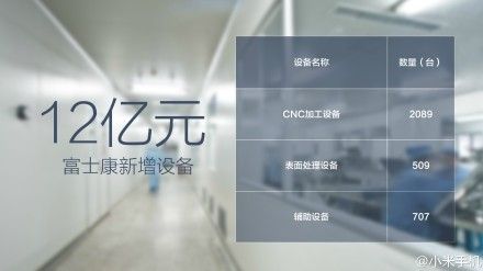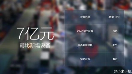 小米介紹,不銹鋼金屬邊框制程復雜度極高,從2013年2月立項,歷經18個月6代工程機。由富士康(Foxconn)和赫比(Hi-P)代工,并為此新增生產設備投入19億元,其中富士康12億元,赫比7億元。