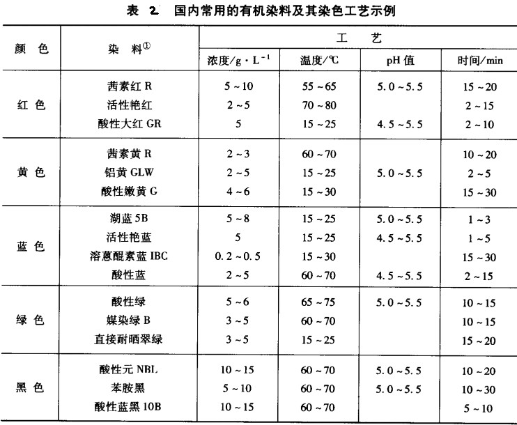 有機染料按色系分為紅、黃、藍、綠、黑等顏色,表2是國內常用的有機染料及其染色的工藝示例,實際應用中應按照染料的染色說明操作。國外的有機染料更加豐富,染色效果也比較好,尤其是歐洲的公司。但是要想達到優良的效果,必須按照說明書嚴格控制染料濃度,染色液pH值和溫度等參數,不可隨意變化,這在國內有機物染色中是需要特別引起注意的。