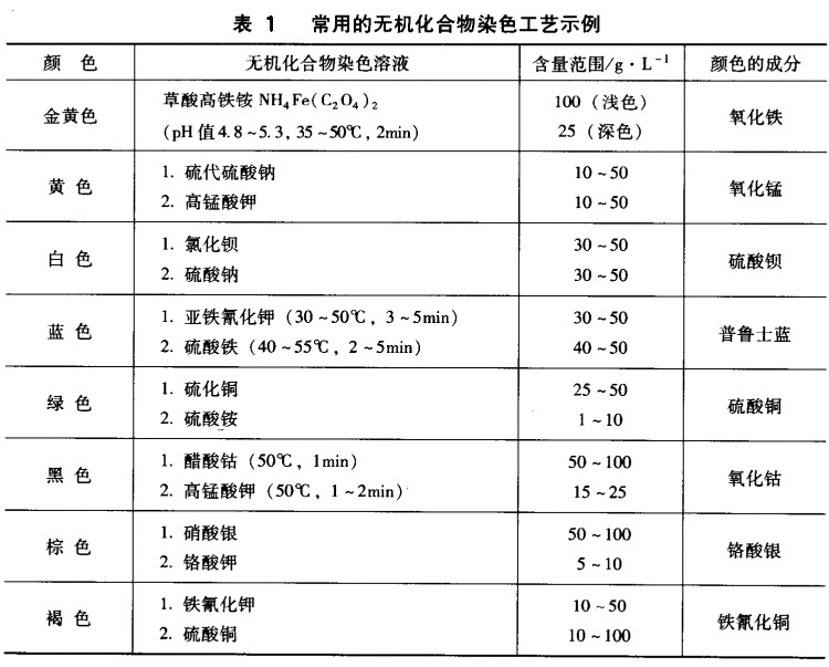 無機顏料染色一般是通過常溫下在金屬鹽溶液中進行浸漬,將有顏色的無機化合物引人陽極氧化膜的微孔中實現的。(導讀:大朗氧化廠家告訴您哪些因素會影響鋁合金陽極氧化著色 http://www.whsygw.com/Article/yingxianglvhejinyang_1.html)無機顏料染色有一步法和兩步法兩大類,草酸鐵錢染金黃色是目前典型的一步法無機顏料染色工藝。大部分無機物染色是兩步法完成的,例如無機顏料染白色,先在氯化鋇溶液中浸漬幾分鐘,清洗后再在硫酸鈉溶液中浸漬幾分鐘,兩種化合物反應生成白色的硫酸鋇沉積在陽極氧化膜微孔之中。常用的無機顏料及陽極氧化染色工藝如表1所示,除了第1行是一步法陽極氧化染色之外,其余均是兩步法無機染色工藝。表1給出了無機化合物的含量范圍,含量高者染色比較深,可由用戶自行調整使用。