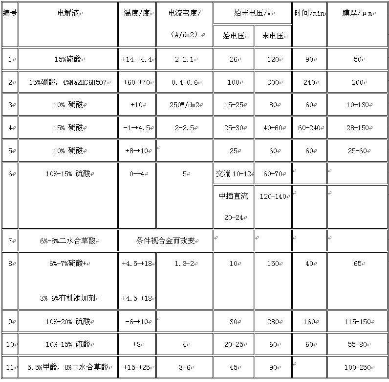 硬質(zhì)陽極氧化是鋁及鋁合金表面生成厚而堅硬陽極氧化膜的一種工藝方法。硬質(zhì)膜的最大厚度可達250μm,純鋁上形成的膜層微硬度為12000-15000MPa,合金的一般為4000-6000MPa,與硬鉻鍍層的相差無幾,它們在低符合時耐磨性極佳,硬質(zhì)膜的孔隙率約為20%左右,比常規(guī)硫酸膜低。某些硬質(zhì)陽極氧化工藝見表-7。