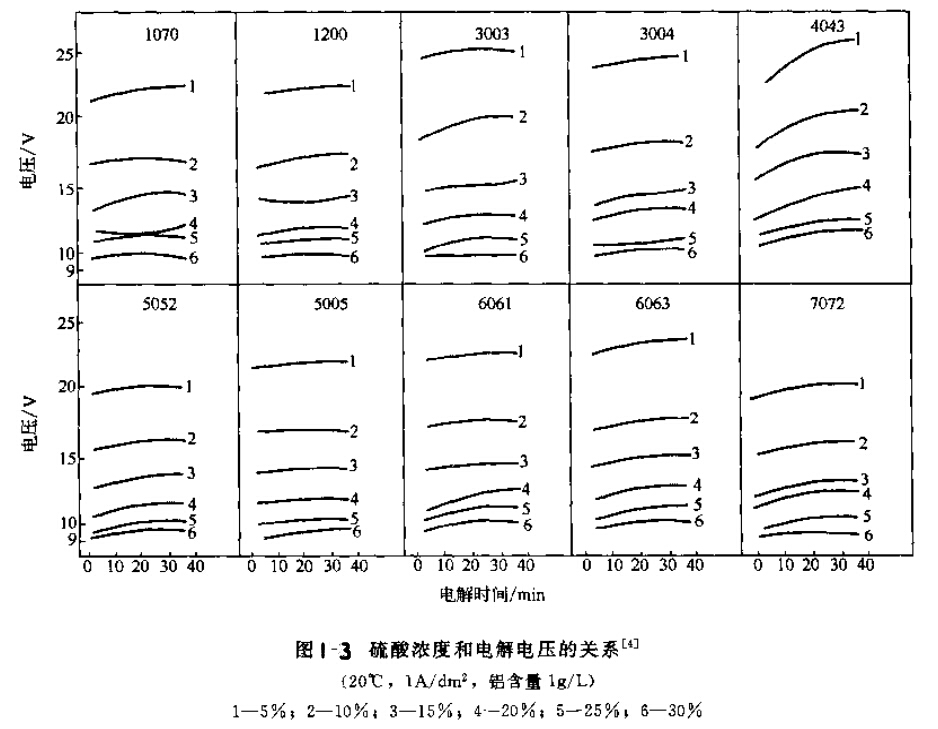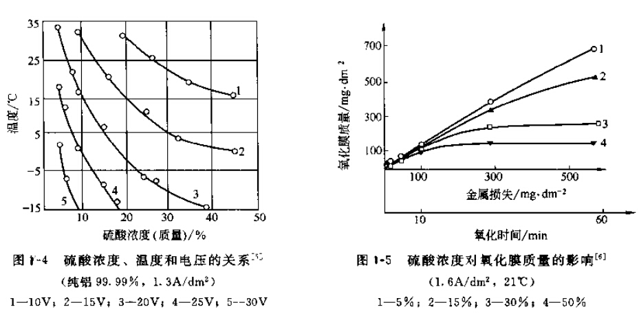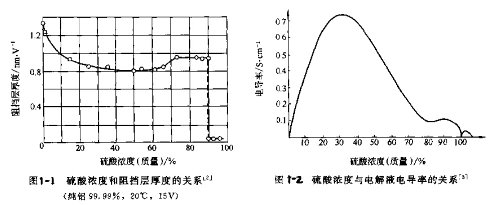 硫酸濃度高,對陽極氧化膜的溶解作用大,形成的阻擋層則薄,維持一定電流密度所需的電壓降低;反之.阻檔層則厚,所需的電壓升高(見圖1-1)