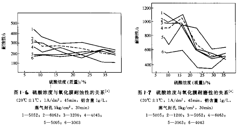 (1)硫酸濃度。改變硫酸濃度對陽極氧化膜的阻擋層厚度、電解液的導電性和對陽極氧化膜的溶解作用、陽極氧化膜的耐蝕性和耐磨性以及后道處理的封孔質(zhì)量都將產(chǎn)生一定的影響。