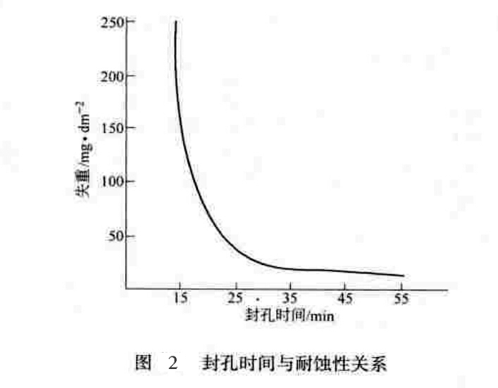 (4)時間、溫度:在其他條件相對一致的前提下,隨封孔時間的延長,膜層結(jié)合水量增加,抗蝕性提高(見圖2);隨封孔溫度的升高,水化程度提高,抗蝕性增強(qiáng)。如果封孔溫度低于78℃時,y-AI2O3與水反應(yīng)生成鋁膠即