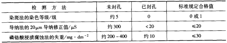 鋁陽極氧化膜封孔質量的檢測方法有染斑法(微孔封孔后吸附性下降)、導納法(封孔后絕緣性提高從而導納值下降)、磷鉻酸浸漬腐蝕法(封孔后耐腐蝕性顯著提高)。硝酸預浸的磷鉻酸腐蝕試驗已經被認定為建筑鋁材用陽極氧化膜的仲裁試驗,而無硝酸預浸的磷鉻酸試驗是其他保護或裝飾用陽極氧化膜的仲裁試驗。表1中“未封孔和已封孔陽極氧化膜封孔質量的檢測”的數據反映出封孔處理前后三種方法的檢測結果。